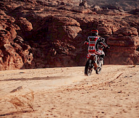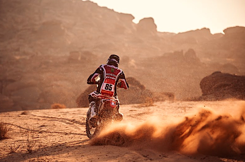Nach technischen Problemen auf der sehr steinigen Etappe des Vortages verbrachte Martim Ventura eine lange Nacht im Marathon-Camp, um seine Honda CRF450RX RALLY zu reparieren. Da ihm nur wenige Alternativen zur Verfügung standen, konzentrierte sich der portugiesische Fahrer darauf, Hail zu erreichen, damit das Motorrad dem Monster Energy Honda HRC Team zur vollständigen Reparatur übergeben werden konnte.