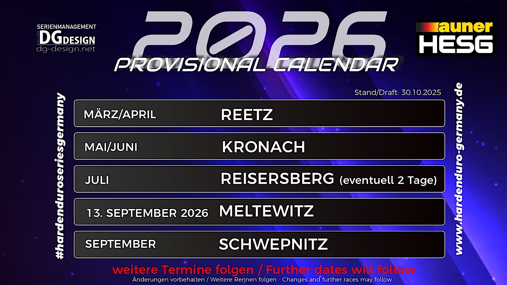 Aktuell umfasst der vorläufige Kalender fünf Veranstaltungsorte. Weitere Gespräche mit potenziellen Austragungsorten laufen noch. Da die Termine der Hardenduro-Weltmeisterschaft und der Enduro-DM noch nicht vollständig feststehen, können sich im Laufe der Planungen noch Änderungen ergeben.