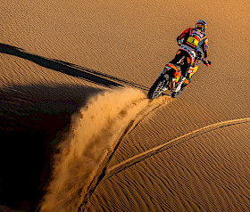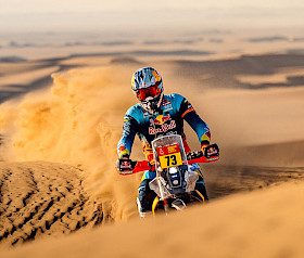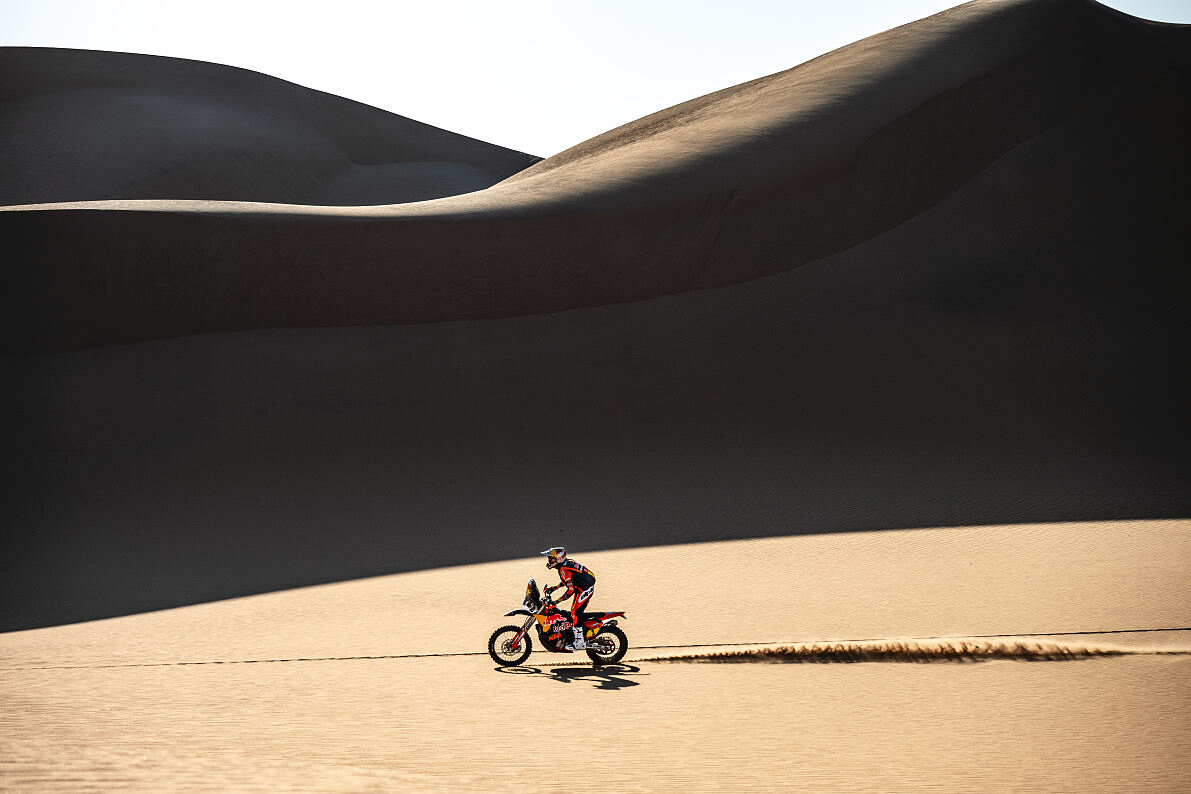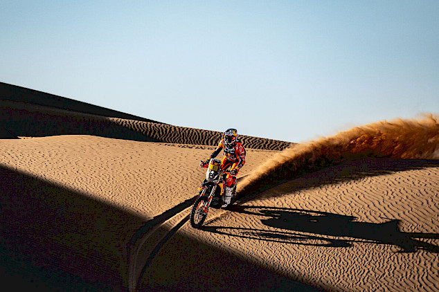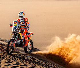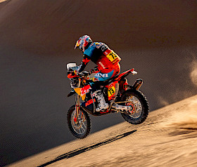 Als zweiter Fahrer auf der Etappe konzentrierte sich Sanders darauf, seinen Teamkollegen Benavides einzuholen. Doch als beide KTM-Fahrer bei Kilometer 34 eine schwierige Passage im Roadbook meisterten mussten, verloren sie Zeit und die Verfolgergruppe verkürzte den Vorsprung. Von da an fuhr Daniel in einer Gruppe bis ins Ziel und konnte sein Tempo den Bedingungen anpassen, um Schäden an seiner KTM 450 RALLY zu vermeiden. Mit dem zweiten Platz auf der Wertungsprüfung und fast fünf Minuten Bonuszeit führt Sanders nun die Rallye mit sechs Minuten und 24 Sekunden Vorsprung an.