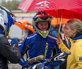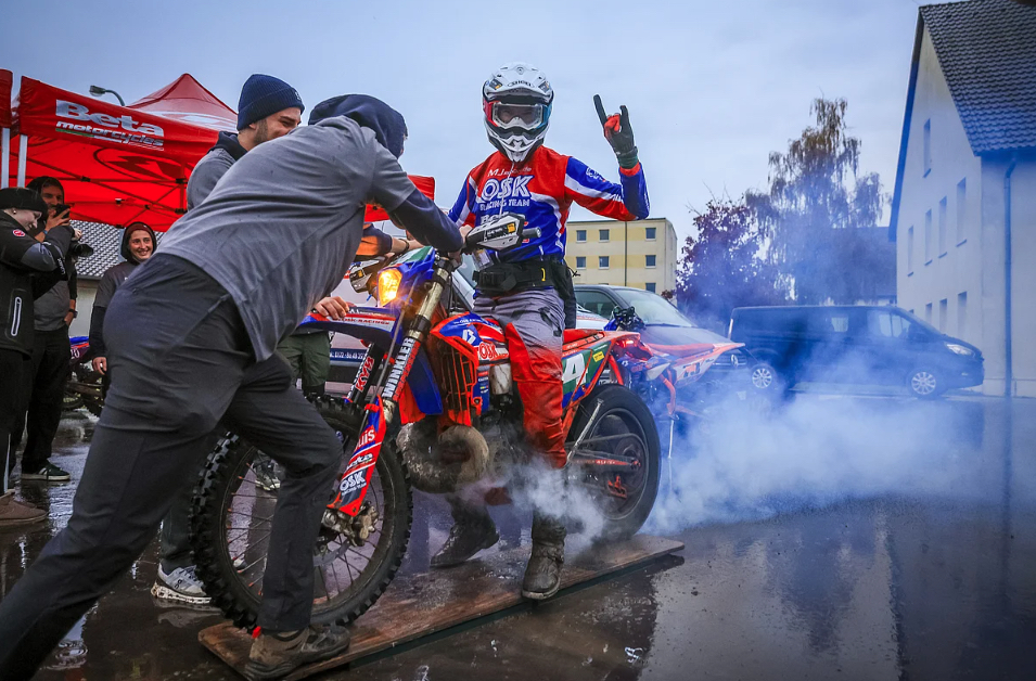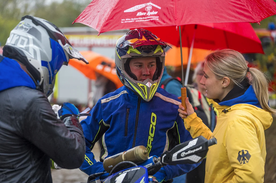 Am Nachmittag startete das A-Championat, das Finale der DEM. Jeremy Sydow, Titelverteidiger und einer der Favoriten, startete stark, fuhr präzise Linien und setzte früh Bestzeiten. Alles deutete auf eine erfolgreiche Titelverteidigung hin. Doch in der fünften Sonderprüfung passierte das Unglück: Seine Maschine blieb stehen. Vier Minuten, in denen er selbst Hand anlegte, das Team fieberhaft werkelte – kurz sprang der Motor wieder an, doch wenig später versagte das Motorrad endgültig. Ein Kabelbruch, unscheinbar, aber folgenschwer, zerstörte die Chancen des jungen Titelverteidigers auf den Meistertitel.