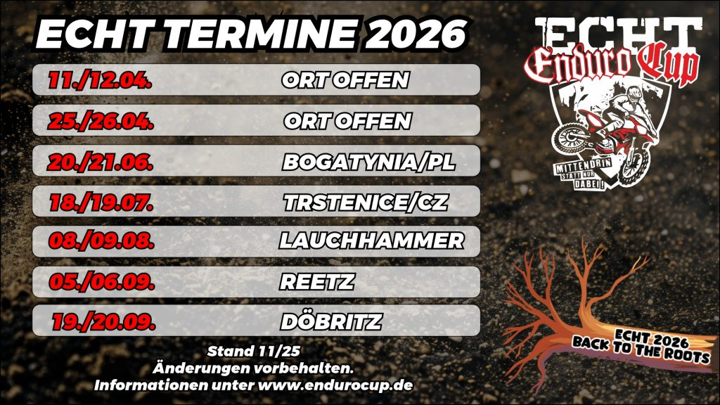 Im Jahr 2026 startet der ECHT Endurocup unter dem Motto „Back to the Roots“ in eine neue Saison. Unter dieser Überschrift wollen die Organisatoren von ECHT einen Blick zurückwerfen, um gewohnte Beständigkeit und Bewährtes neu zu beleben. Lasst euch überraschen.