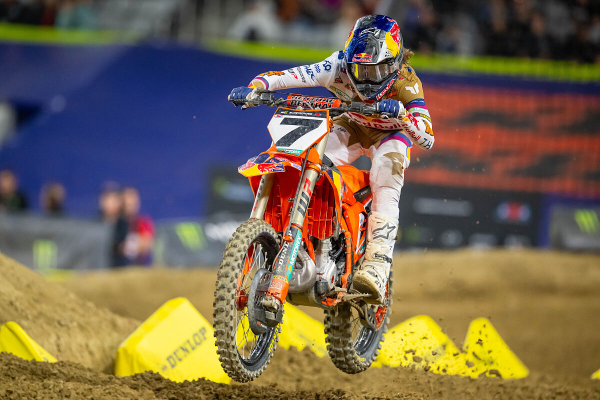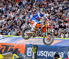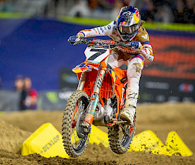 Auch Aaron Plessinger hatte einen vielversprechenden Abend in San Diego. Die Nummer 7 überwand eine Krankheit und belegte in seinem Vorlauf den dritten Platz, direkt hinter Tomac. Ausgestattet mit der KTM 450 SX-F FACTORY EDITION, fuhr „The Cowboy“ im Hauptrennen lange Zeit unter den Top Fünf, bevor er sich einen hart erkämpften siebten Platz sicherte. Mit diesem Ergebnis liegt Plessinger in der 450SX-Meisterschaft auf dem achten Platz, wenn die Serie am kommenden Samstag im Angel Stadium in Anaheim fortgesetzt wird.