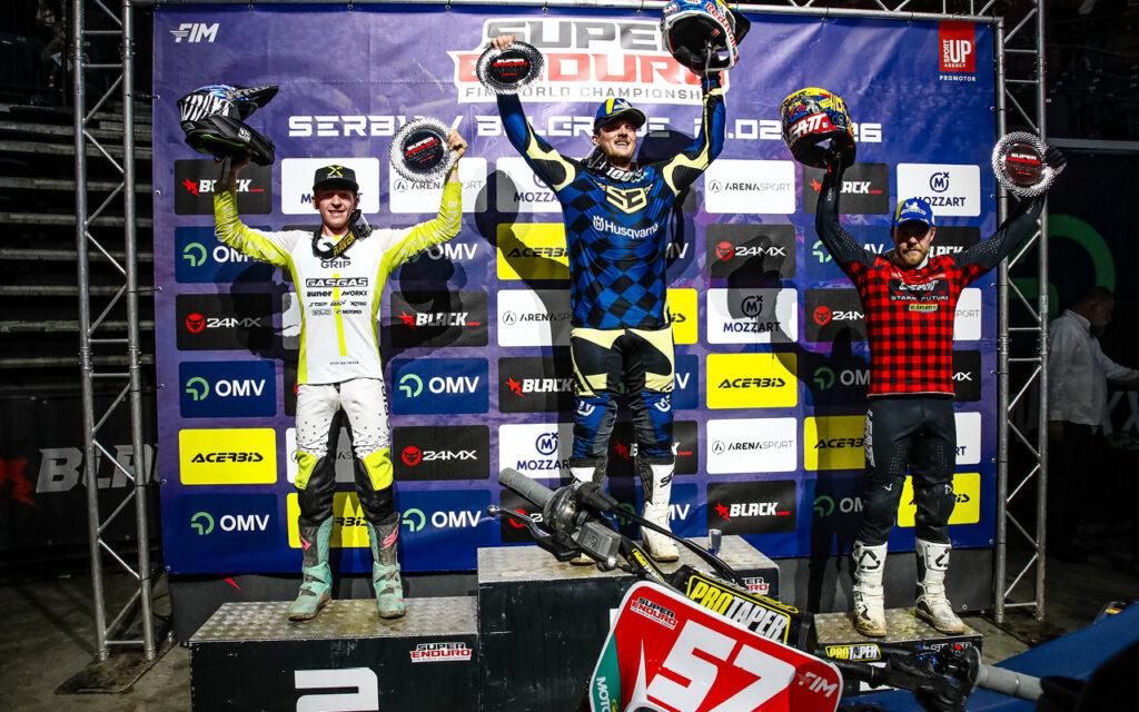 Dank seiner Ergebnisse 2-1-2 konnte sich Gómez in Belgrad den Gesamtsieg in der Juniorenklasse mit einem Punkt Vorsprung sichern und damit sowohl für den Spanier als auch für Stark den ersten Sieg in der SuperEnduro-Serie feiern. Shaw, der Zweiter wurde, liegt nun mit Schmüser punktgleich an der Spitze der Meisterschaft, zwei Läufe vor Schluss. Lampkin zeigte in Serbien eine starke Leistung und wurde mit dem dritten Platz bei seinem Debüt auf dem Podium belohnt. Strauss und Piazza belegten die Plätze vier und fünf.