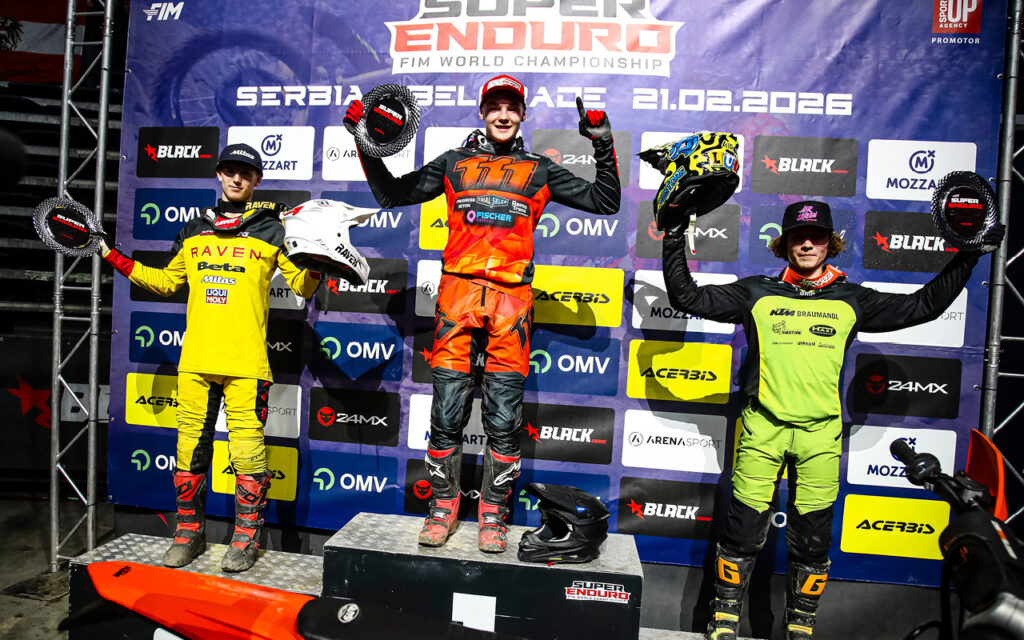 Wojtek Walczak (KTM), der sich im Youth Cup als der Fahrer etablierte, den es zu schlagen gilt, feierte beim SuperEnduro GP von Serbien einen Doppelsieg im Meisterschaftslauf. Der junge Pole zeigte sich in Belgrad von Beginn an stark und arbeitete sich im ersten Finale schnell auf den zweiten Platz hinter dem Spanier Eneko Martinez (Beta) vor. Er erhöhte den Druck, übernahm in der fünften Runde die Führung und sicherte sich schließlich den Sieg im ersten Rennen. Martinez belegte den zweiten Platz, während der Österreicher Luca Kropitsch (KTM) eine starke Leistung zeigte und Dritter wurde.