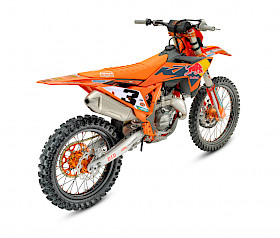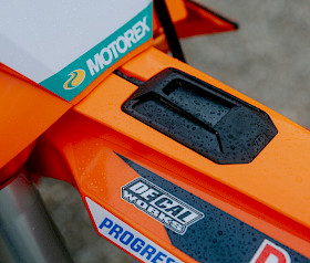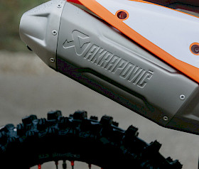 Dank eines neuen Kühlerverschlusses (der zudem den Zugang erleichtert) und einer frisch gestalteten Schutzkappe für das Quick-Lock-Kraftstoffsystem. Durch präzise Konstruktion von Luftbox, Luftfilter und Einspritzung – in enger Zusammenarbeit mit Partner Akrapovič – erreicht der überarbeitete Titan-Endschalldämpfer die FIM-konformen 109 Dezibel, ohne dass charakteristisches KTM SX-F Drehmoment und Leistung verloren gehen.
