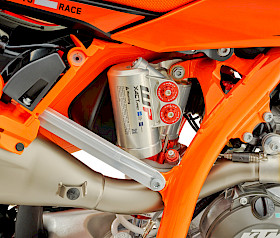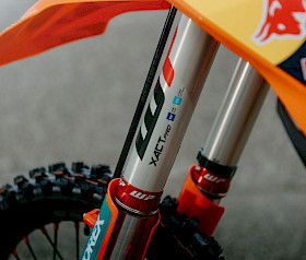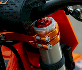 Die 48 mm Gabel mit einzigartigem Kegelventil-System (shim-less) und 310 mm Hub lässt sich individuell anpassen: 15 Einstellungsstufen der Feder stehen zur Wahl. Zudem lassen sich Kompression, Zugstufe und Dämpfung bis ins kleinste Detail feinjustieren – wahlweise über die CUO oder die KTMconnect App.