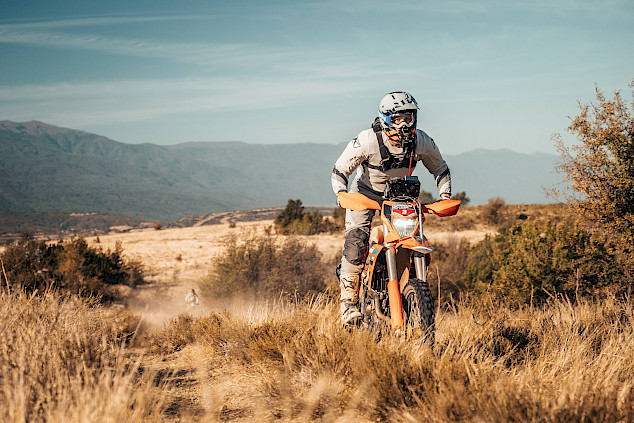 Über eine sehr schöne Verbindungsetappe, die fast ausschließlich Offroad verlief, gelangten wir an den Start der Etappe. Dieser befand sich zunächst noch auf einem Weg, der von Geländewagen befahren werden konnte, laut Roadbook sollte der Track jedoch bereits nach eineinhalb Kilometern abseits der Piste verlaufen. So kam es auch: Ich startete sehr langsam in die Etappe und fand mich bereits nach kurzer Zeit in einem Gelände voller großer Felsen, das einer steilen, hochalpinen Weide glich. Bereits vor der Etappe hatte ich das Roadbook genau studiert und so sollte es – zumindest in meiner Vorstellung – zunächst durch ein Tal, dann auf einen Hügel, entlang dessen Kamms und anschließend wieder hinab gehen. In der Praxis sah ich allerdings früh Fahrer bis etwa 500 Meter links und rechts von mir. Stoisch folgte ich den Navigationsanweisungen im Roadbook und achtete kaum auf den Kilometerzähler, denn dieser war durch die vielen Felsen, die es zu überwinden galt, ohnehin nicht mehr korrekt. Als es nach etwa sechs Kilometern nach Kompass den Hügel hinauf und anschließend wieder hinab ging, wusste ich, dass ich noch richtig war.