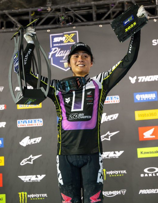 Honda HRC Progressive krönte auf dem Las Vegas Motor Speedway eine unglaubliche Saison 2025 mit einem Sieg bei der dritten Ausgabe der SuperMotocross-Playoffs. Jett Lawrence holte sich die 450er-Meisterschaft, während Jo Shimoda die 250er-Krone holte. Dies war das dritte Jahr, in dem die einzigartige Serie mit drei Rennen ausgetragen wurde, und Lawrence hat alle drei Titel der Königsklasse gewonnen; es ist gleichzeitig der zehnte AMA -Titel in seiner Karriere als Profi für Lawrence, der letzten Monat gerade 22 Jahre alt geworden ist.