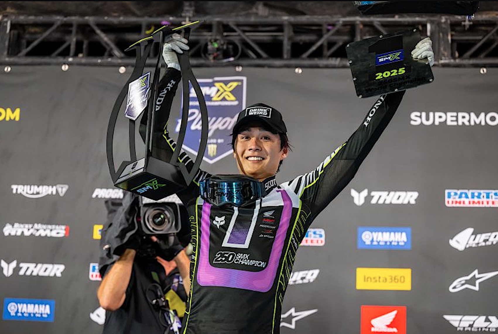 In den drei Läufen der SuperMotocross-Playoffs holte Shimoda dann zwei weitere Gesamtsiege und sicherte sich den Titel. Damit schrieb er Geschichte als erster japanischer Fahrer, der eine professionelle AMA-Meisterschaft gewann.