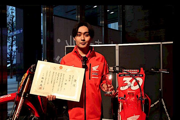 Im Rahmen einer feierlichen Zeremonie am Mittwochabend im Hotel New Otani in Tokio wurde Honda HRC Progressive-Fahrer Jo Shimoda mit dem Kanto Sho Award („Kampfgeist“) ausgezeichnet. Dieser Preis ist eine von mehreren Kategorien des Japan Professional Sports Grand Prize, der als Japans prestigeträchtigste Auszeichnung im gesamten Sportbereich gilt. Im vergangenen September gewann Shimoda die 250er SuperMotocross-Meisterschaft und schrieb damit Geschichte als erster japanischer Fahrer, der einen professionellen AMA-Titel errang. Bei seinem Debüt in der 450er-Klasse im Oktober, als er für das Team Japan beim Motocross der Nationen antrat, erzielte er zudem respektable Ergebnisse mit den Plätzen 2 bis 6.