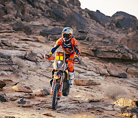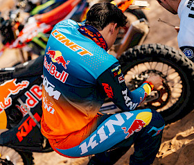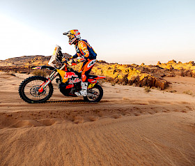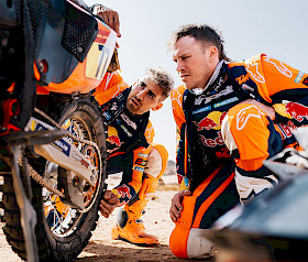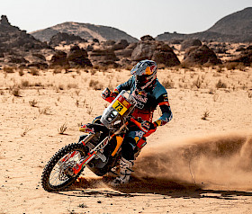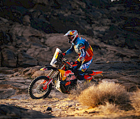 Daniel Sanders bewältigte einen schwierigen zweiten Tag der Marathonetappe und zeigte eine kontrollierte und kluge Fahrt, die ihm den dritten Platz auf der fünften Etappe sicherte. Da er nach den ersten Kilometern den zunehmenden Verschleiß seiner Reifen bemerkte, passte der Australier sein Tempo an, um sowohl das Bike als auch sich selbst auf der anspruchsvollen Etappe zu schonen. Durch Anpassung seines Tempos im mittleren Teil der Etappe konnte Sanders seinen Zeitverlust auf die Führenden begrenzen und die Gesamtführung der Rallye Dakar zurückerobern.