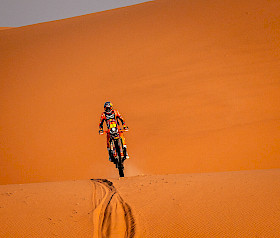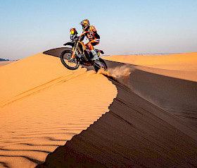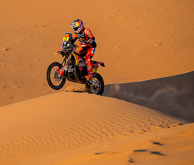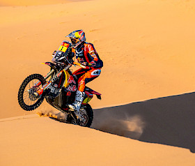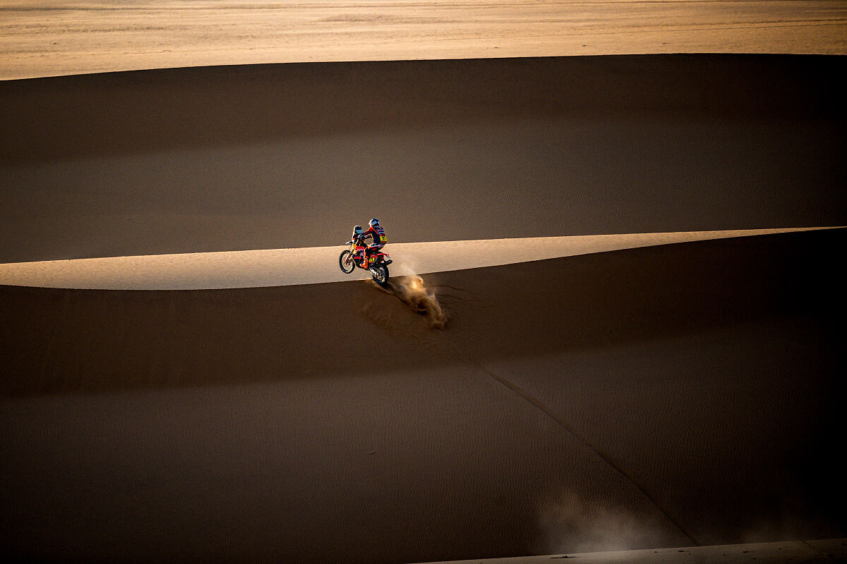 Daniel Sanders: „Die Etappe war heute extrem schnell und die Navigation einfacher, was es sehr schwierig machte, Zeit auf die Fahrer an der Spitze gutzumachen. Von Startplatz vier aus bedeutete jeder kleine Fehler, dass es keine Chance gab, den Rückstand aufzuholen, es sei denn, die Führenden patzten. Der Wind war am Ende stark, drückte das Motorrad hin und her und erschwerte es, Höchstgeschwindigkeit zu erreichen. Staub und Sand peitschten uns ins Gesicht und beeinträchtigten die Sicht. An der Spitze ist es jetzt viel enger, aber ich bin trotzdem froh, eine weitere Etappe beendet zu haben. Jetzt können wir uns neu formieren und uns auf die letzten Tage vorbereiten.“