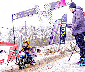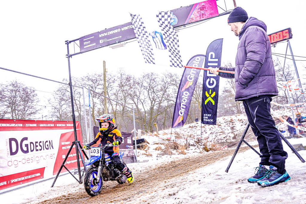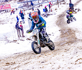 Auch der Nachwuchs ließ sich von den winterlichen Bedingungen nicht abschrecken. Trotz des Handicaps durch geringe Motorleistung und kleine Räder hatten die Kids-Klassen sichtlich Spaß auf der verschneiten Strecke von Jüterbog. Auf einer verkürzten Runde absolvierten die Sieger Melvin Gohlke (50ccm) und Dylann Kummrow (65ccm) jeweils fünf Runden.