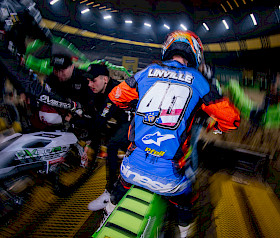 In der „kleinen“ Supercross-Klasse SX2 trat das Team Kawasaki Motul Pfeil nach verletzungsbedingten Absagen mit zwei neuen Piloten an. Während für den erst 17-jährigen Franzosen Basile Pigois die Trauben noch zu hoch hingen, kam der fünf Jahre ältere US-Amerikaner Gage Linville von Tag zu Tag besser in Schwung. Am ersten Abend verpasste er noch den Einzug ins Finale, doch am Samstag, der „Nacht der Fans“, stürmte er trotz suboptimaler Ausgangslage mit der ihm anvertrauten Kawasaki KX250 auf Rang drei und stand somit anschließend auf dem Podest.
