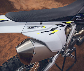 Die TF 450-X verfügt weiterhin über den einzigartigen Aluminiumrahmen von Triumph, eine ultraleichte Doppelschleifenkonstruktion, die Steifigkeit und Flexibilität für ein sicheres Handling ausbalanciert. Die hydrogeformte Schwinge und das im Rennsport entwickelte Umlenksystem reduzieren das Gewicht und maximieren gleichzeitig Grip und Traktion. Dies trägt zu hervorragendem Grip und Fahrgefühl an der Hinterachse bei.